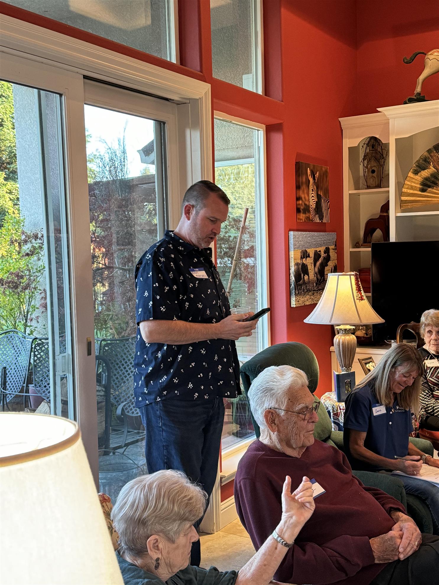 Anne Eckert (left) and her committee did another outstanding job hosting the 2nd annual Fireside Chat and social at Don and Linda Fuller's home Monday evening. Thank you Anne and George for also bringing the delicious appetizers. Area 6 Governor Kurt Raffetto spoke briefly about the impact of Rotary internationally and members Anne, Dave Sargent (below), President Cathy Dugan, Adam Marshall (right), and Joe Ryan spoke from the heart describing the "why" of Rotary. The individual talks were very heartfelt; Adam's comment about Greg Woods, "we do