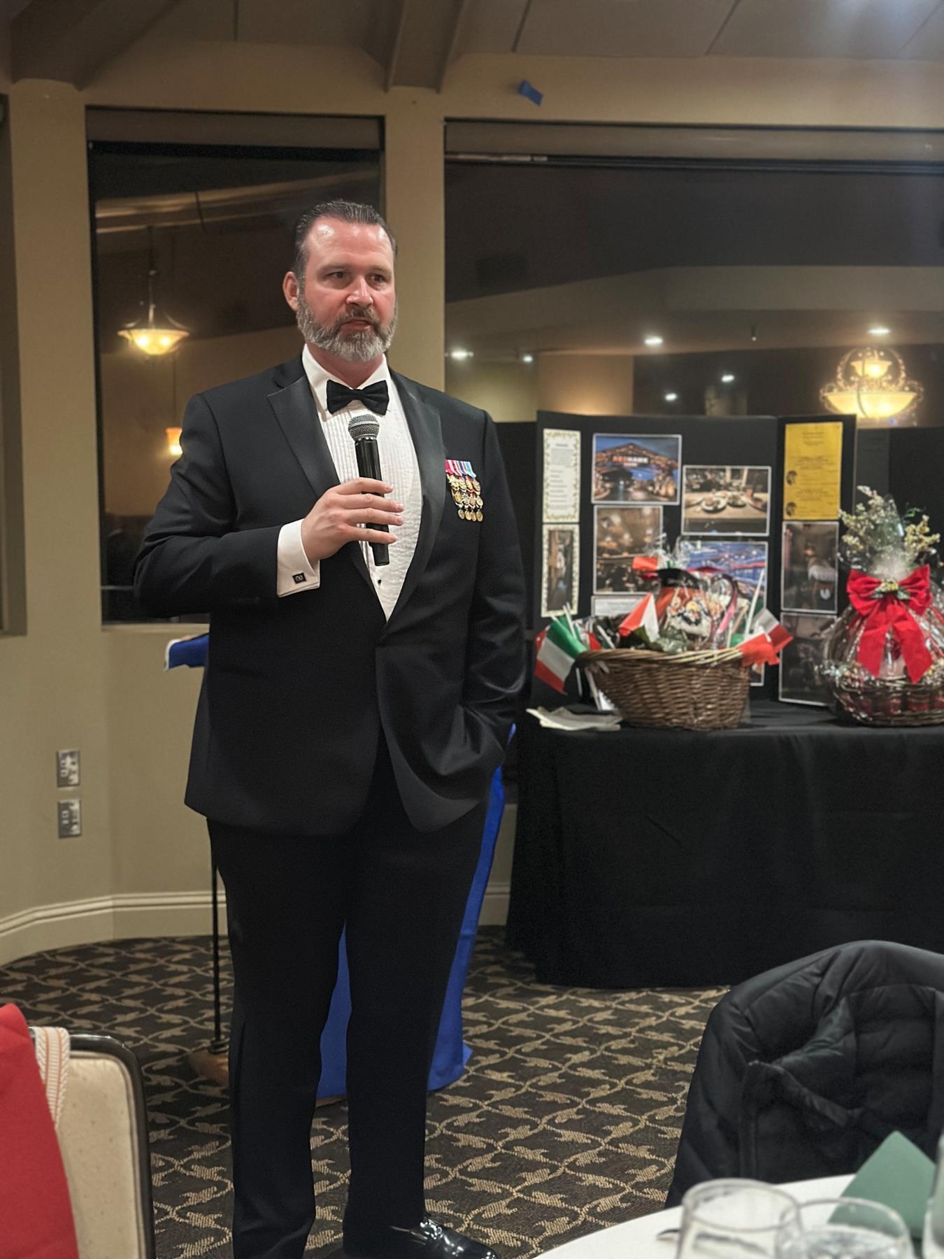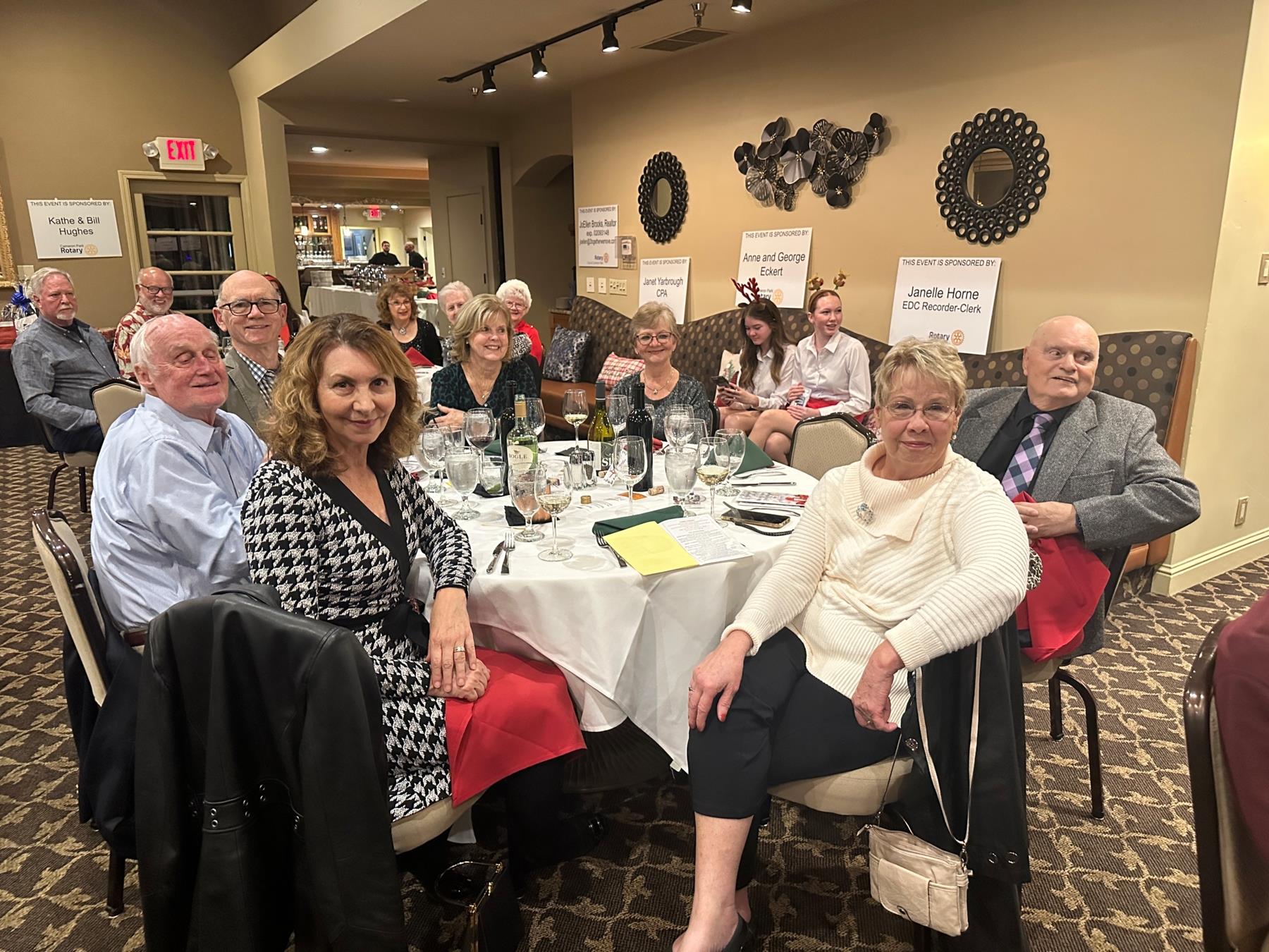 Our annual Christmas dinner and auction was a great success! With a full house of nearly 100 guests and Rotarians, the Country Club produced a sumptuous dinner. The mood was festive and fun, led by our terrific MC and auctioneer, Adam Marshall who used humor and the art of the silly moment to keep the group having fun, drinking and bidding on items. The Christmas committee did a great job led by Dan Gott, chair, and members Marlyn Pino-Jone, Dave Sargent, Tom Elken, Cathy and Mike Dugan, not to mention Marlyn's good friend Melonie. We will have financial results soon, but the bidding was generous.