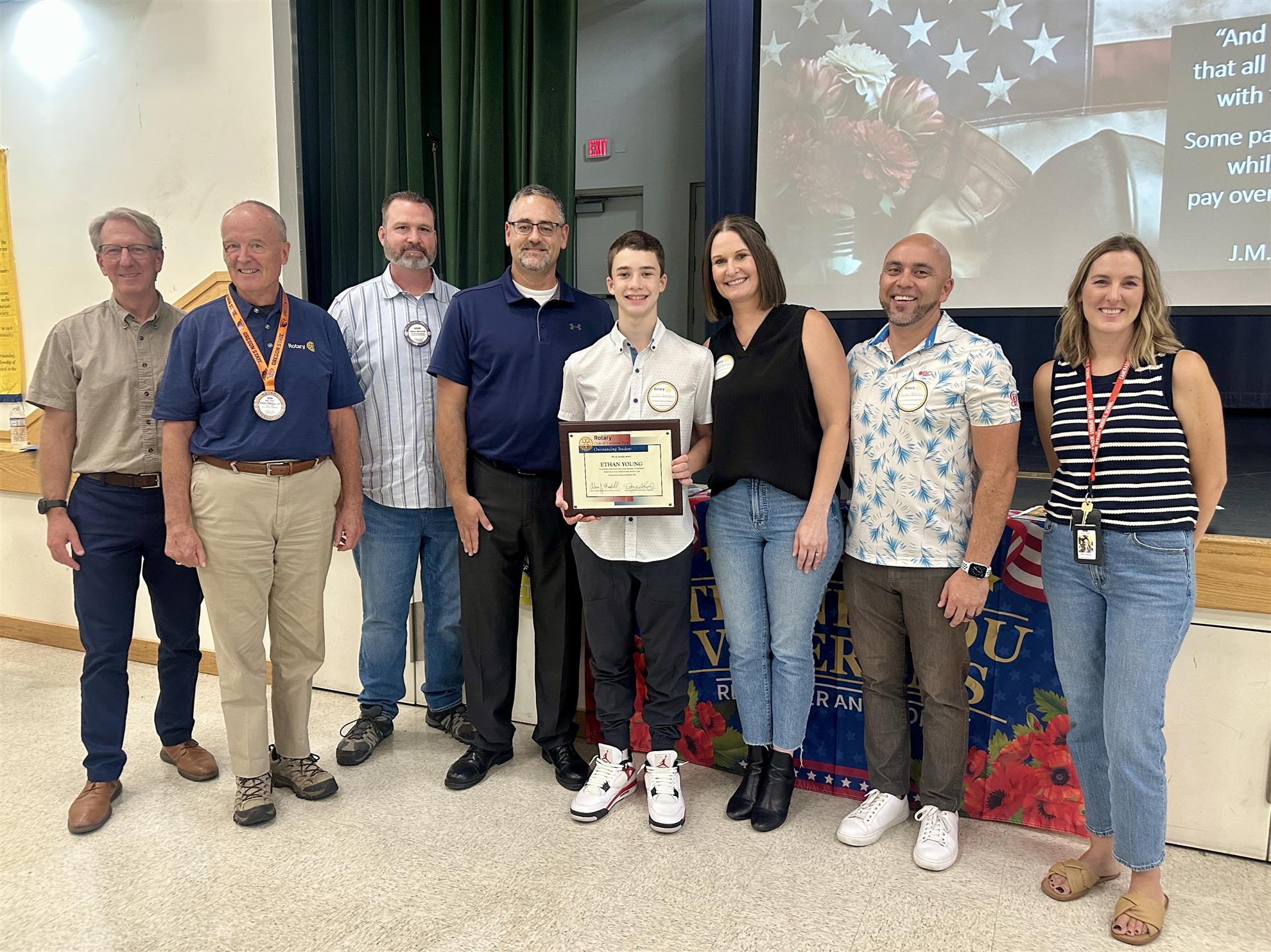 Pictured left to right - BUSD Superintendent David Roth PhD., Area Governor Don Fuller, President Adam Marshall, Principal Doug Shupe, Ethan Young, Mary Young, Matt Young, and Vice Principal Sara Matley.
