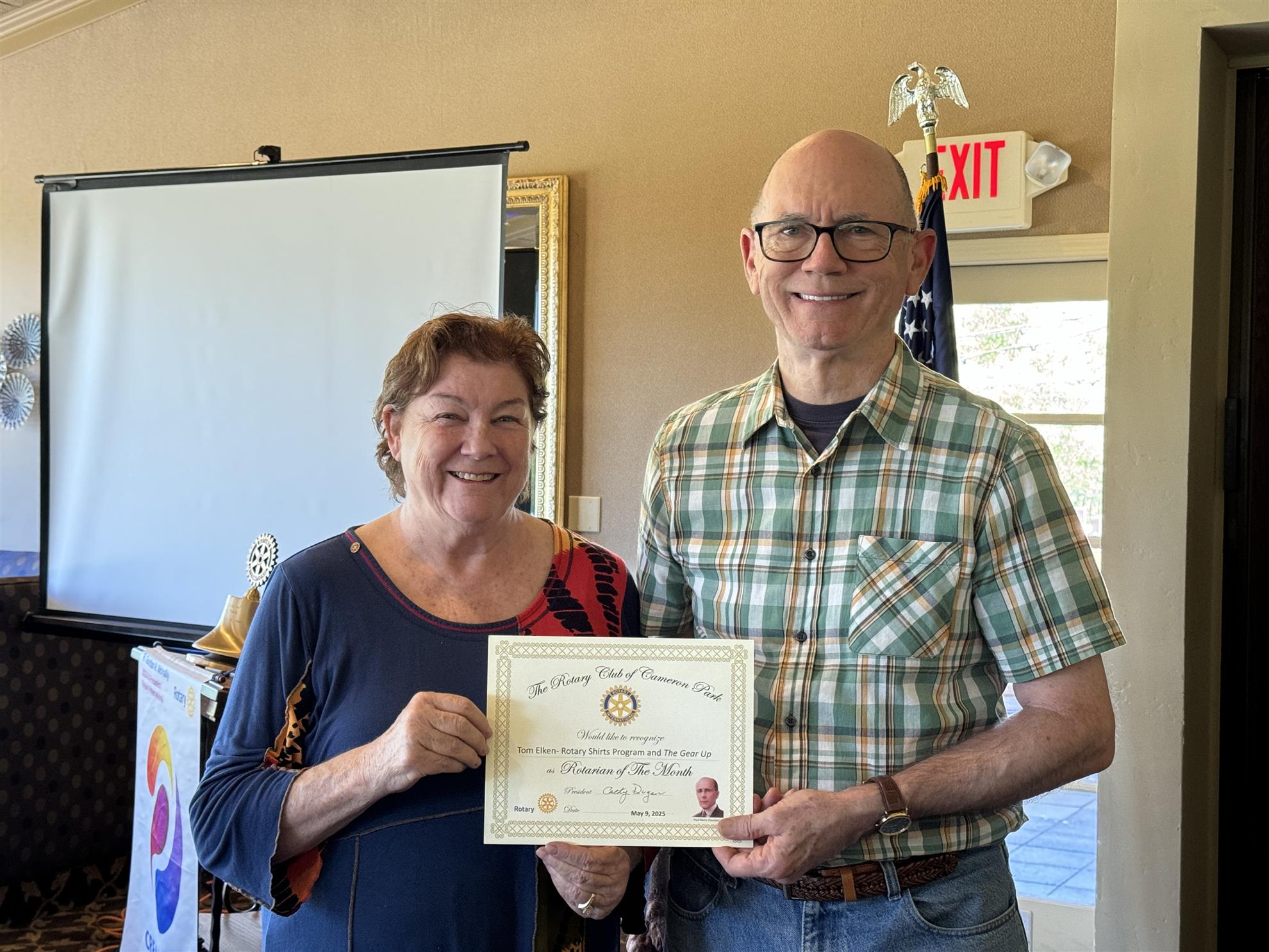 2) Cathy also honored Tom Elken as The Rotarian of the Month for his great efforts in Public Image (the Rotary Polo shirt project & Signs project) and the as author and editor of the Gear Up.