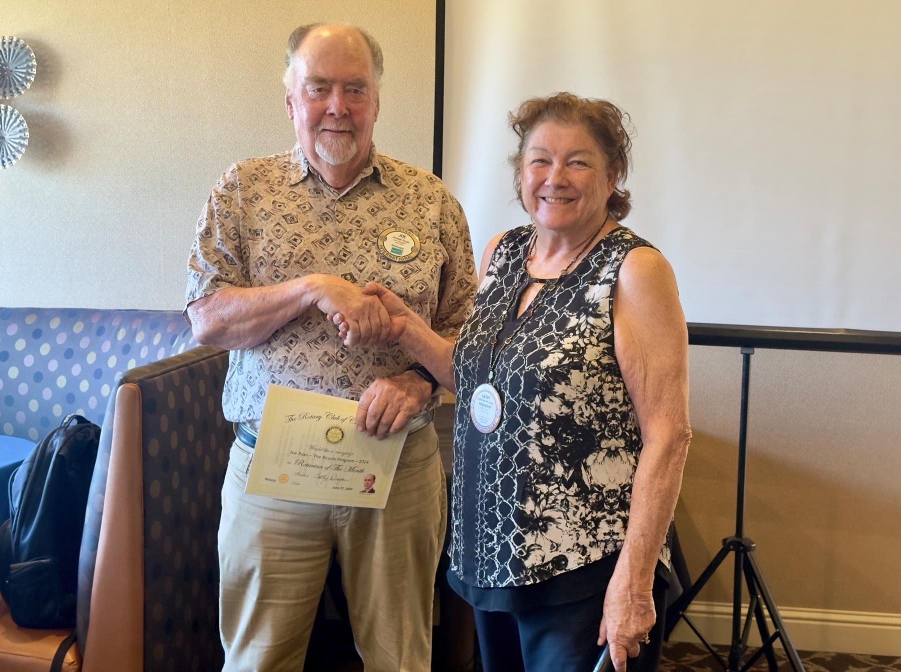 President Cathy also recognized Joe Ryan as "Rotarian of the Month" or as she said "Rotarian of the Year" for his efforts with the club's famous bike program (pictured). Joe reported on his meeting with the new Acting Warden at the Folsom State Prison, Joseph R. Tuggle, presenting him with a packet of club materials and an Award for his Community Service. Warden Tuggle has been on the prison staff for years and is very supportive of the bike program, calling it "the best inmate program we have". Also included was a letter from President Cathy Dugan, inviting the warden to join us as an Honorary Member. The Warden is a graduate of Ponderosa High school and lives in Cameron Park.