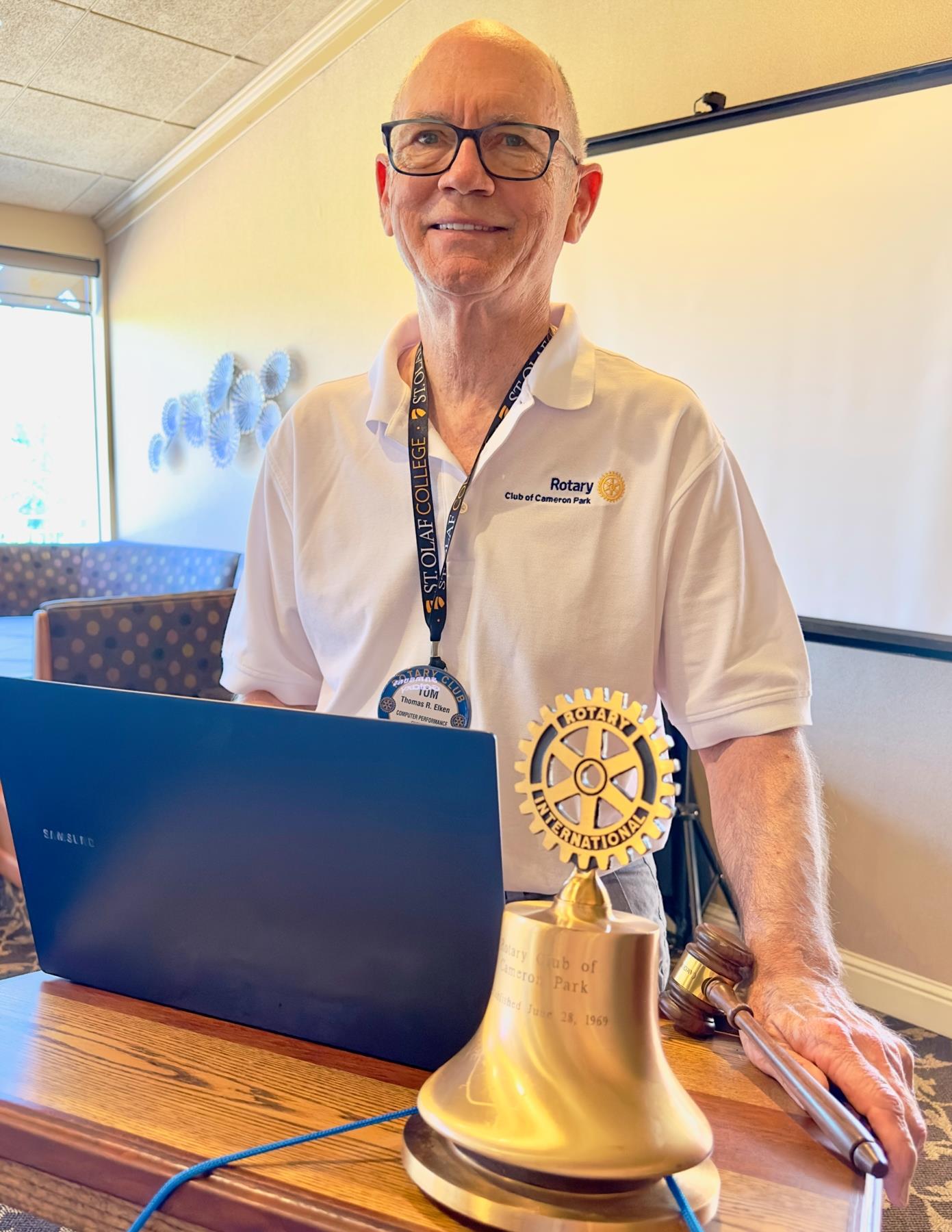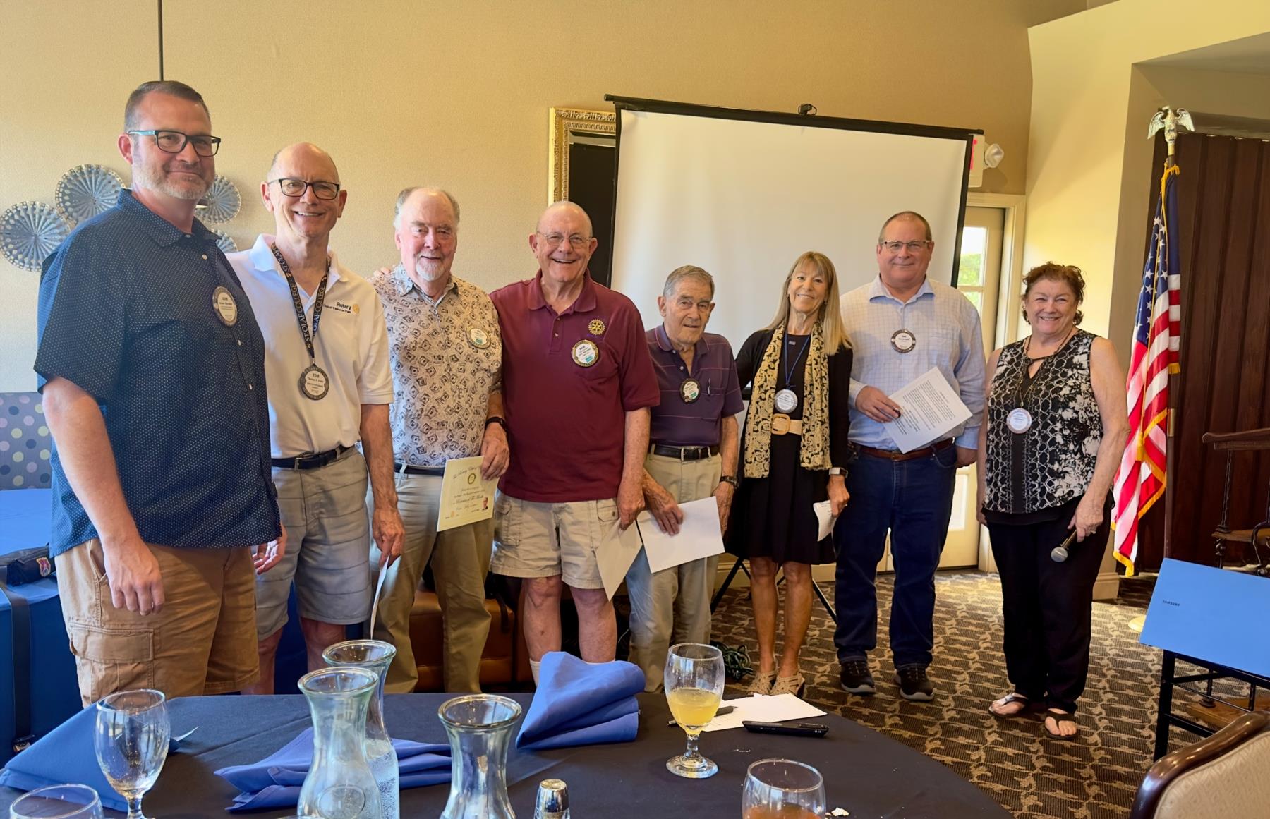 President Cathy Dugan recognized her last board by awarding them with "Challenge Coins" from what once was a military tradition to today where organizations give out coins to symbolize the identity, values and achievements of groups like Rotary. The beautiful metal coins had Cameron Park Rotary and RI on one side and these words on the other: "We are Rotarians. Our beliefs, values and character, unites us in our efforts at making this a better world. As Rotarians, we are stewards for doing good in the community. Coins were presented to those board members present including, Adam Marshall, Tom Elken, Joe Ryan, Dave Sargent, Bill Ettlich, Anne Eckert and Dan Gott. (pictured). President Cathy also inducted new officers and directors for 2024-2025, including President: Cathy Dugan, Secretary: Bill Ettlich, Treasurer: Dan Gott, President-Elect: Adam Marshall, Club Service: Marlyn Pino-Jones, International: Dave Sargent, RI Foundation: Bill Hughes, Community Service: Joe Ryan, Membership: Anne Eckert, Youth Service: Sid Bazett and Public Image: Tom Elken.
