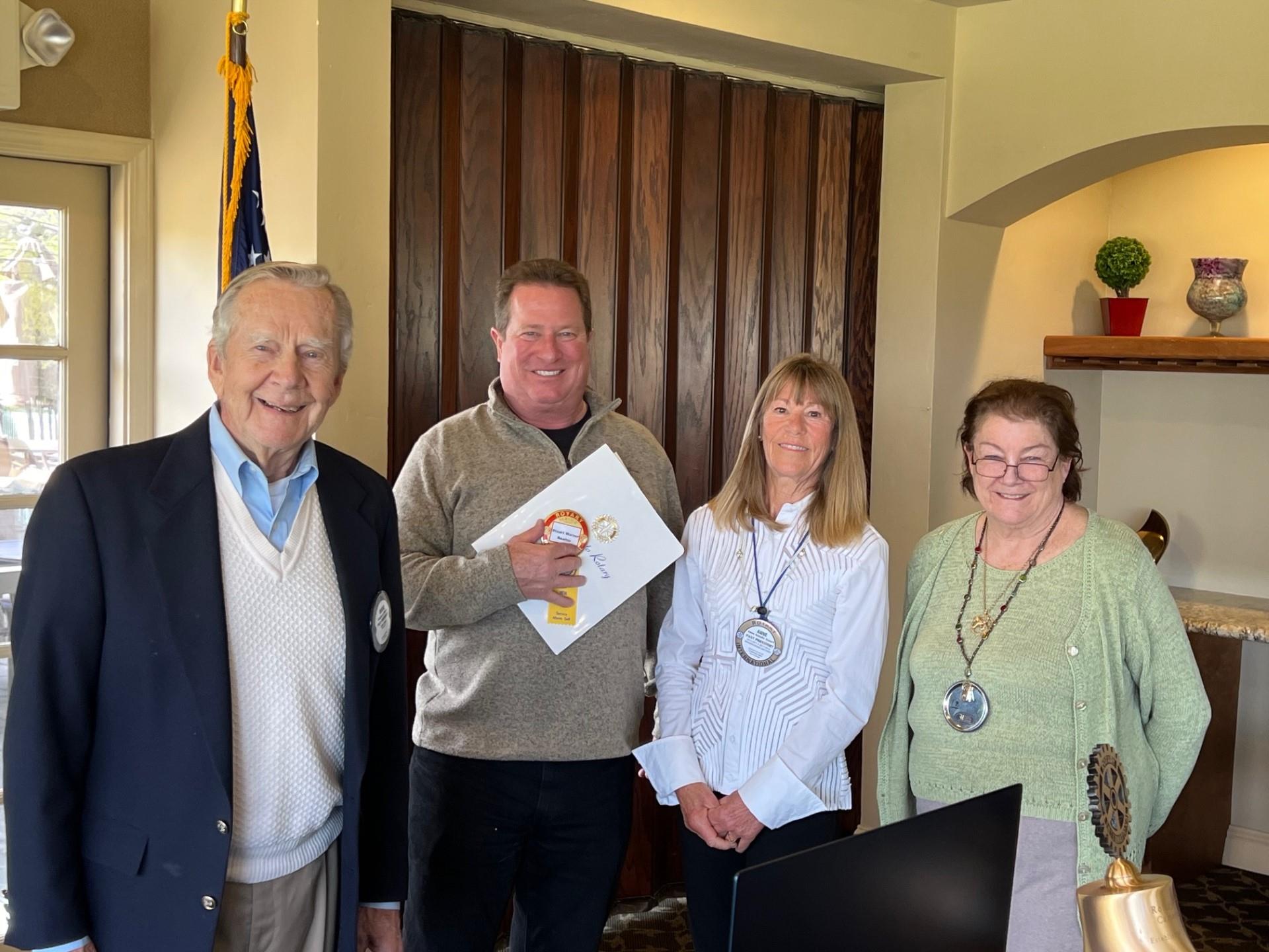 Anne Eckert announced and presented new member Stuart Warner with his Red Badge and other Rotary materials. Shown here with Stuart is his sponsor Doug Bisbee, Membership Chair Anne, and Prez Cathy Dugan.